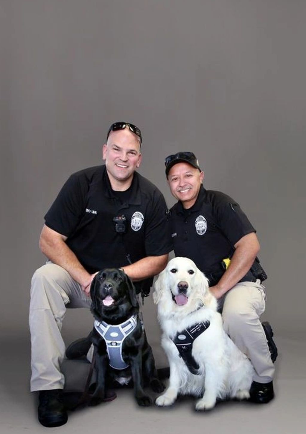 GARDEN GROVE POLICE DEPT RSO WITH TWO THERAPY DOGS AT GARDEN GROVE UNIFIED SCHOOL DISTRICT CA THERAPY DOG.